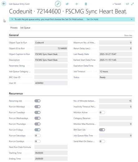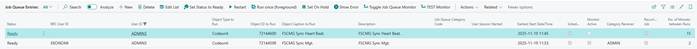 - FSCMG Sync Heart Beat. – This job queue is to secure the status of FSCMG Sync Mgt, if the job queue is in status Error, Heart Beat will set it to Ready again.